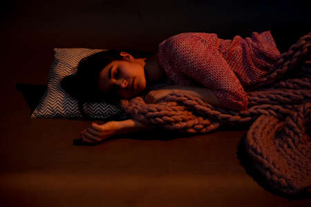 The girl lies on the floor, covered with a pink plaid, illuminated by a warm light