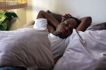 Young African man lying under grey blanket in double bed between small table and wooden shelves while sleeping