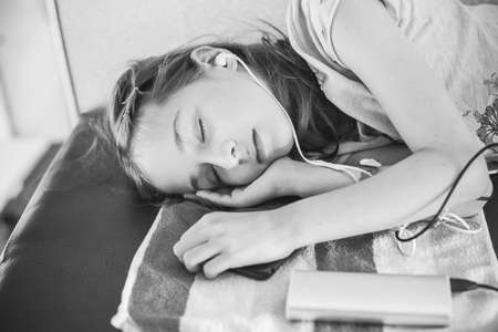 The girl accidentally fell asleep in bed at noon. The girl sleeps in the afternoon in clothes. Short restorative daytime sleep.
