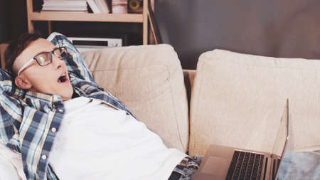 Sleepy freelancer yawns while lying with computer on couch. Guy in eyeglasses and plaid shirt is bored at home during quarantine. Remote work concept. Tinted image.