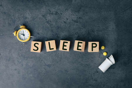 Word Sleep made of wooden cubes near pills and alarm clock on gray background, flat lay. Insomnia concept