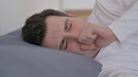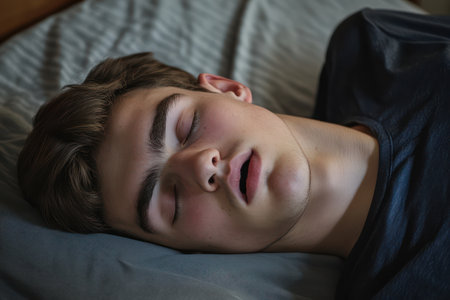 Male lies on back sleeping with open mouth, demonstrating snoring and possible sleep disorder in a home environment.