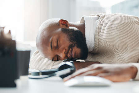 Im too exhausted to work. a handsome young businessman sleeping on his desk during the day.