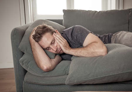 Tired frustrated millennial man at home, thinking over problems, feeling stress, fatigue and suffering from headache. Sadness and unhappy life. Cheerless sad depressed man lying on sofa over a cushion