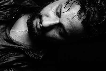 Vulnerable, scared, depressed, traumatized adult man finding news that makes to fall into mental suicidal state, crying and feeling unhappy, lonely , desperate suffering from physical disorder