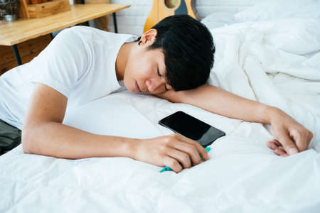 Black hair guy fall asleep while write the letter on the white bed in his bedroom, horizontal.