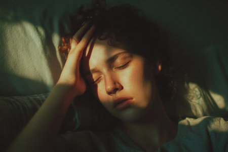 A young person lies in bed, eyes closed, holding their head due to a migraine. Morning light filters through the window, casting shadows on their face and adding to their struggle.