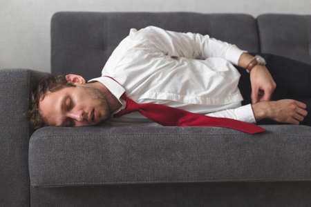 Tired overworked businessman deeply sleep on sofa. He slept all night on the couch in office clothes.