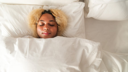 Banner with young African American woman with white curly hair sleeping in bed under white blanket. Sound sleep in cozy bedroom. Sleeping pill and sedative for insomnia.