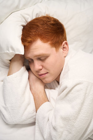 Calm man napping home in pajamas closeup. Handsome student enjoying daydream. Ginger businessman taking break sleeping at remote workplace on lockdown. Sleepy smiling guy resting siesta in living room