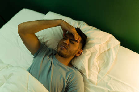 Depressed man suffering from insomnia lying in bed