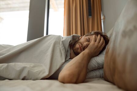 bachelor has hangover. guy at bedroom. lazy sunday. bed time routine. brutal male wake up with headache. relax lifestyle concept. tired bearded man in bed. early wake up at morning