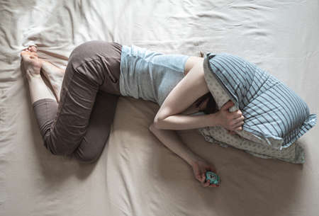 Unslept woman in lying in bed in the morning, covering her head with a pillow and holding an alarm clock in her hands. Concept of a hard start to the day, insomnia due to anxiety or stress. top view.