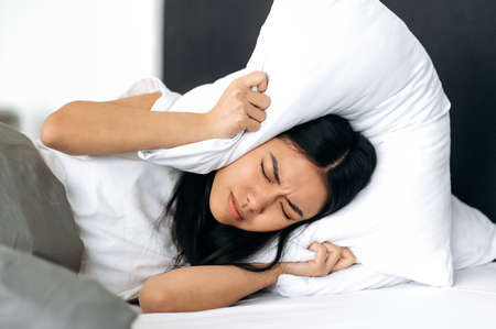 Sleep and rest concept. Sad chinese girl, lying in a bed at home, covers her ears with a pillow, tries to sleep, closes herself from noise, has a bad dream, restless dream