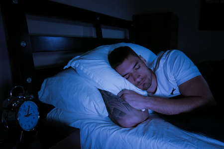 a young man is sleeping in bed at night