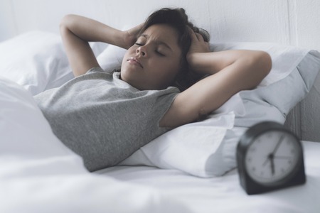 A little black-haired girl holding her head because of a loud alarm in the morning