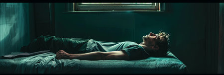 A solitary figure lies on a bed, gazing up at the ceiling with a blank expression, their eyes reflecting a sense of emptiness and despair.