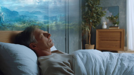 Man peacefully sleeping on a comfortable pillow in a cozy setting, showcasing relaxation and tranquility, sleep wellness concept