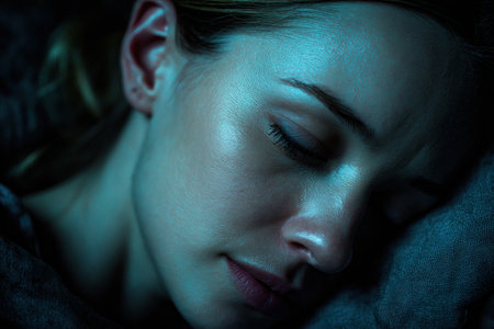 Close-up of a fair-skinned person resting, eyes closed, illuminated in cool tones