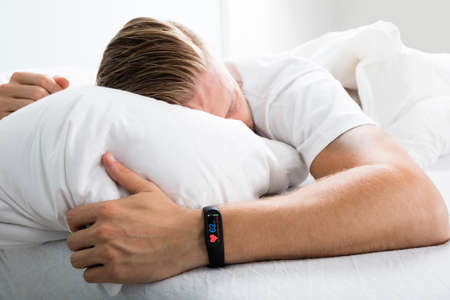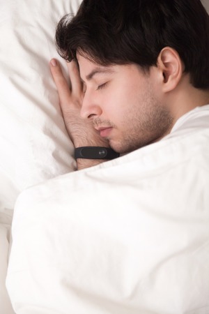 Close up vertical top view of man sleeping on white comfortable bed, wearing digital smartwatch or wristband tracker for monitoring and controlling his sleep. Keeping fit and healthy, time management