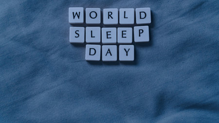 World Sleep Day concept with small lettered stones. Sleeping concept on a soft bed sheet. High angle view