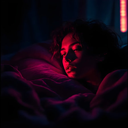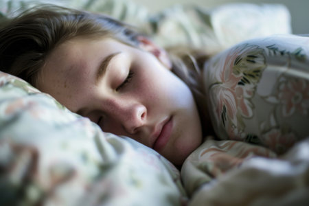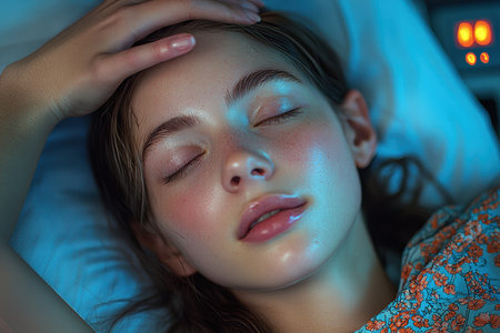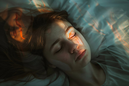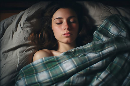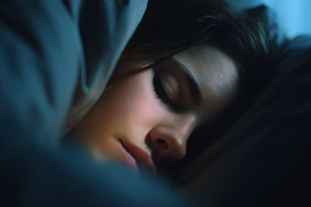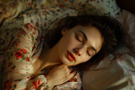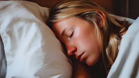 A young woman is peacefully sleeping in a bed, with her eyes closed and body relaxed. The room is dimly lit, creating a cozy atmosphere.