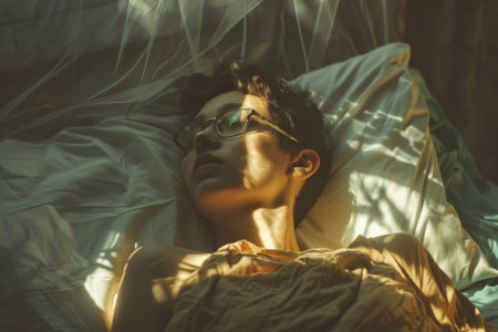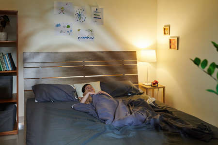 A young man lies in bed, appearing sick with a cold, embracing the comfort of soft blankets and warm light filtering through the room.