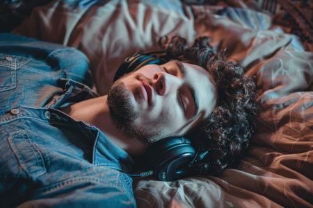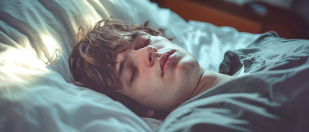 Young man is sleeping soundly in his bed, enjoying a peaceful and restful slumber
