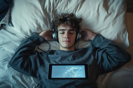 Smiling young man listening to music with wireless headphones and a tablet while relaxing in bed, enjoying a digital break.