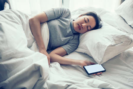 Asian woman sleeping in bed at home and hand holding mobile phone. Woman using smartphone in bedroom. Young woman addicted using smartphone. Texting on cellphone with tired until falling asleep.