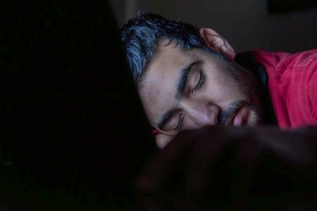 Man peacefully sleeping on a comfortable pillow in a cozy setting, showcasing relaxation and tranquility, sleep wellness concept