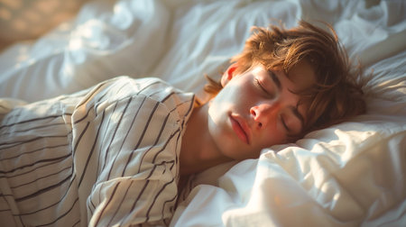 A young man sleeping in a white-blue striped pajama on a white bed in the room , photorealistic, AI generated