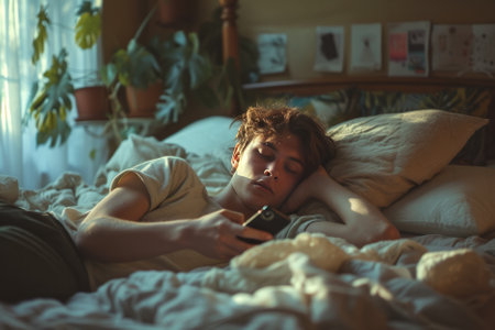 Young caucasian man lay on her bed looking at her phone. AI generative