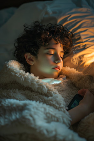Young boy comfortably snuggled under a cozy white blanket while using his mobile phone at home