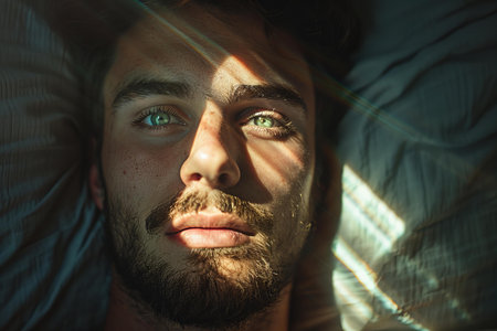 Man with beard and mustache lying in bed at morning. Portrait of handsome guy with beard and mustache.