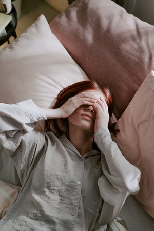 Woman lying on bed with hand covering face, surrounded by soft pillows. Scene portrays a sense of relaxation or fatigue in a cozy bedroom setting