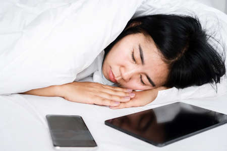 nomophobia concept Asian woman sleeping with mobile phone and tablet in bed, internet, technology addiction