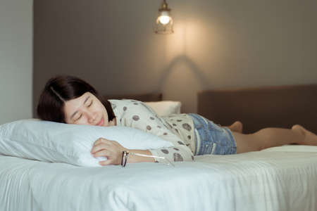 Asian woman sleeping lie on the stomach on bedroom,Good dream,Daydream,Happy time