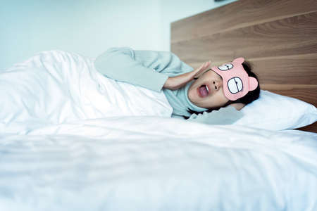 Happy young woman resting at home lying on the bed in her sleeping mask and pajamas