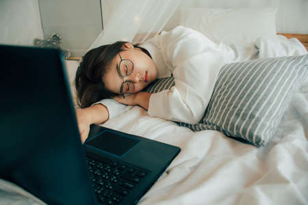 Beautiful asian girl in white pajamas sleeps on the bed with laptop at home. Overworked businesswoman sleeping over a computer. young tired woman fall asleep. people and lifestyle concept.
