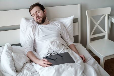 Man was very tired and fell asleep in bed with an ultrabook after he finished working remotely. Concept of quarantine.