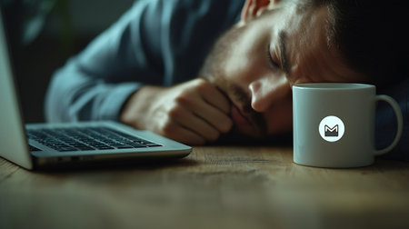 Man sleeping on the table with a laptop and a cup of coffee