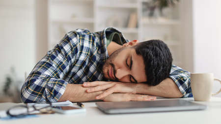 Sleepy middle east young man sleeping. People lying on bed in bedroom in early morning at home. Lifestyle