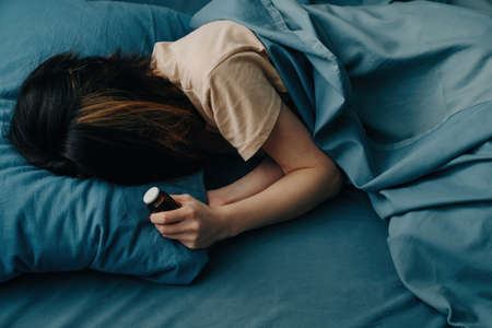 Young woman in bed with antidepressant pills in her hands.