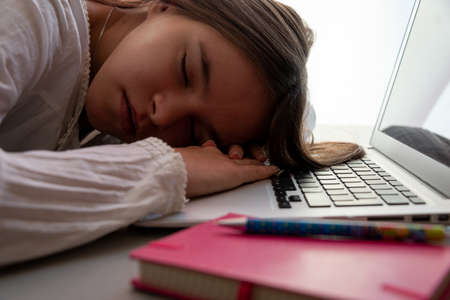 young woman sleeping with head on computer keyboard, student or buissness woman working from home, overworking or overtired.