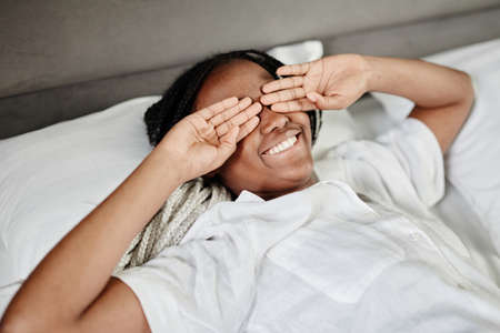 Portrait of smiling African-American woman waking up in morning and stretching, copy space