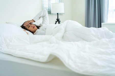 Unhappy thoughtful young asian woman touching her forehead, feeling sad lonely lying in bed alone trying to sleep thinking of problem, fears, worries and hopeless.