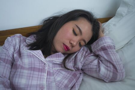 lifestyle portrait of young beautiful and sweet Asian Chinese girl on her 20s alone at home sleeping relaxed wearing pajamas lying on bed happy and comfortable resting and dreaming