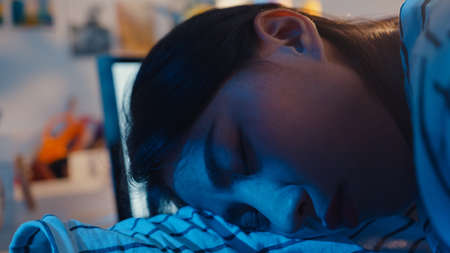 Close-up of sleeping office worker. Tired clerk and computer on working table. Young woman laying on pillow on desk. Female work long hours. Deadline and business concept