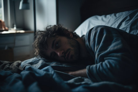 Depressed sleeping man in bed at home. Concept for mental health awareness
